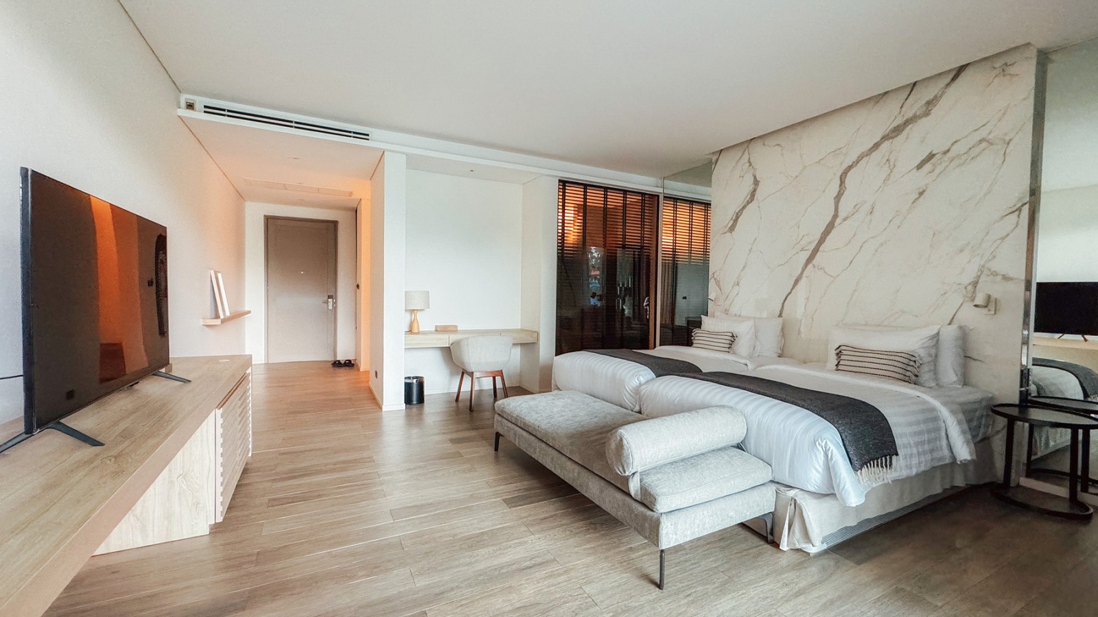 A spacious bedroom for 2 guests, featuring 100% cotton bed linens and towels that provide a soft and luxurious feel. The large glass window allows you to sleep and wake up to a view of the pool (the pool is not available for use). It also serves as the door to access the outdoor terrace.